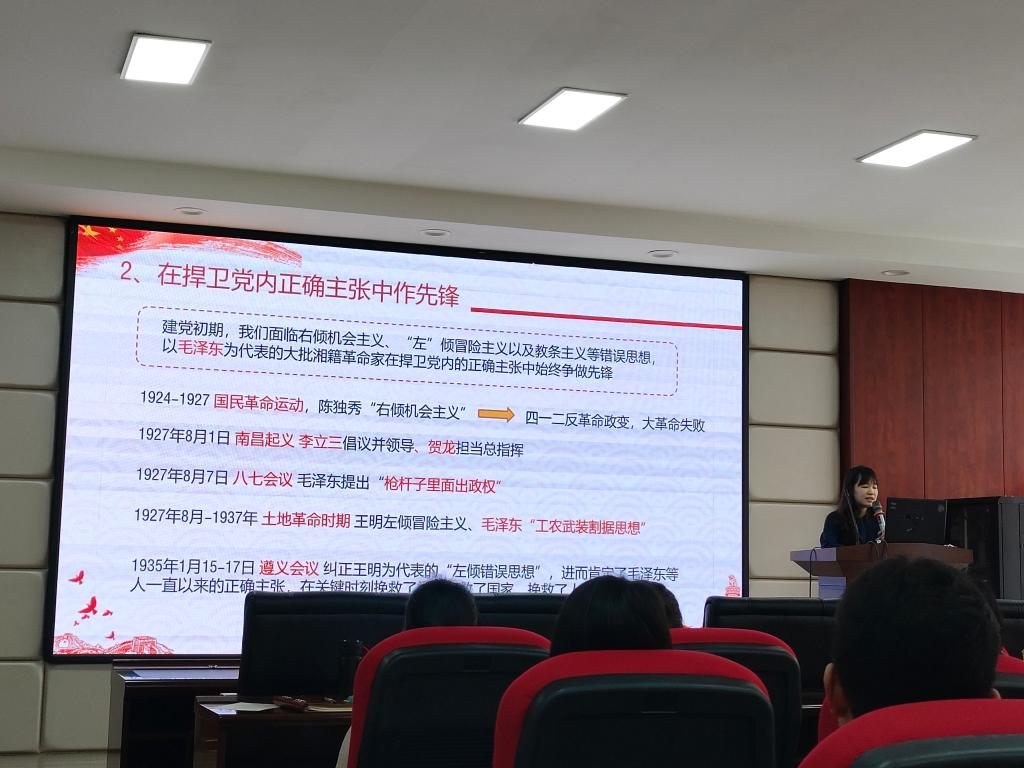 陈雨欣以“伟大建党精神在湖南的生动实践”为主题,以“坚持真理、坚守理想,践行初心、担当使命,不怕牺牲、英勇斗争,对党忠诚、不负人民”的伟大建党精神为主线,带领同学们重温了中国共产党的奋斗历程。她提到,在过去,湖湘大地涌现出一大批的爱国知识分子,像毛泽东、贺龙、蒋先云、徐特立,杨开慧、夏明翰、任弼时、李立三等,他们都是共产主义的忠实追随者,他们用自己的方式表达着对共产主义的坚守和对祖国的热爱。陈雨欣引用他们的事迹讲述了作为新时代的青年,如何坚守和传承建党精神,并为祖国的建设贡献自己的青春力量。