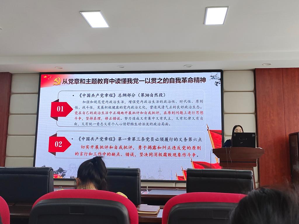 4月19日下午,食品学院在工三A320组织研究生开展理论宣讲活动。宣讲会分为“伟大建党精神在湖南的生动实践”和“勇于自我革命,永葆政治底色”两个篇章,邀请了学校研究生理论宣讲团成员陈雨欣和食品学院优秀共产党员向敏进行宣讲。