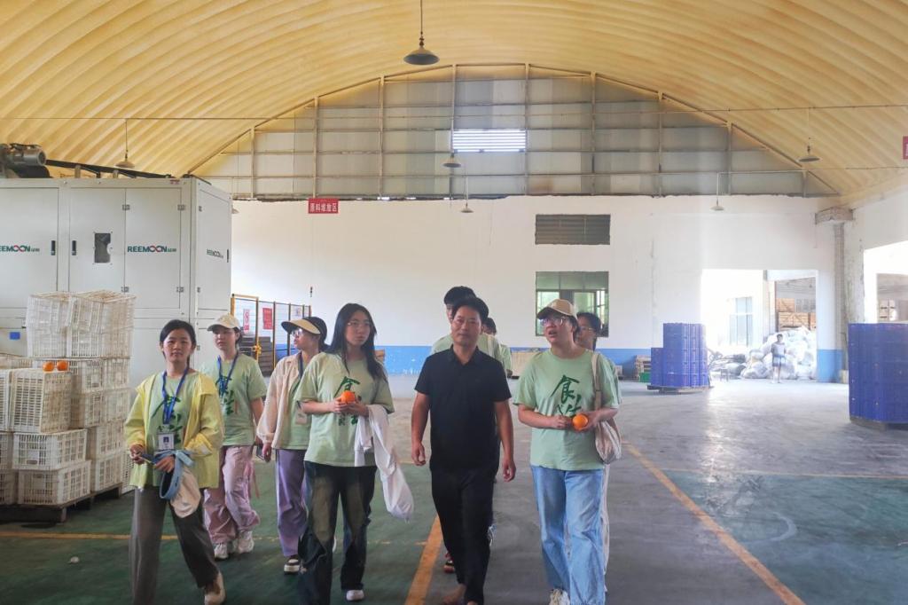 此外,食安兴农团来到老渡村龙头企业——恒发果业进行实地考察。在公司负责人蒋慧明的带领下,成员们依次参观了制筐、清洗、分拣、冷藏、包装等生产环节。现代化的生产线、高效的作业流程以及严谨的质量管理体系,让学子们深刻感受到了现代农业发展的蓬勃生机和广阔前景。同时,他们也对如何提升农副产品附加值和有效拓展市场渠道等问题进行了深入思考。