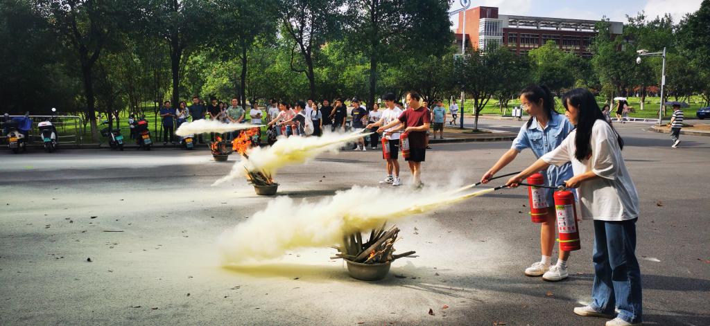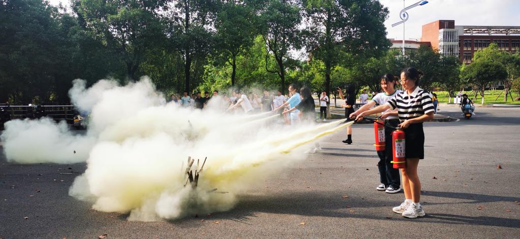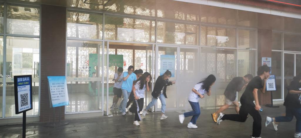 随着邹教官一声“演练开始”,指挥小组人员迅速到岗,沉着冷静地指挥会场的师生们用手捂住口、鼻,尽量将身体放低,沿着走廊通道紧急撤离教学楼,全体人员安全、快速、有序地疏散到了学院一楼大坪。在学校保卫处副处长黄伟和邹教官的指导下,师生一起,共分成三组,每组两人,对现场准备好的火盆进行灭火实操。