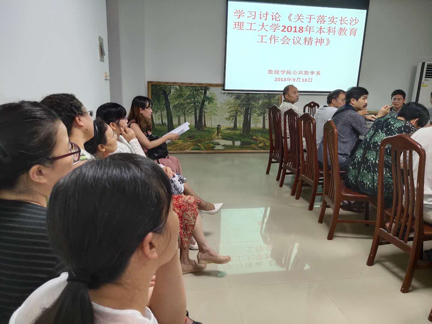 9月18日下午两点,数统学院公共数学系全体教师在理科楼A-503召开了“组织学习《2018年本科教学工作例会扩大会议学习资料》”的教研活动,会议由公共数学系主任谭艳祥主持,全系老师进行了充分的学习和讨论。