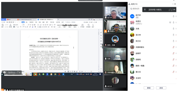 10月11日,统计系召开全系教师线上会议,学习并分享课程思政案例教学经验。会议由系主任朱恩文教授主持。会议过程中,朱主任结合时间序列分析课程的思政教学案例,详细介绍了课程思政的具体内容,包括但不限于思政教学目标、思政教学素材、思政元素引入等环节。朱主任分享课程思政教学案例后,全系老师就课程思政建设思路,课程设计等相关环节进行了热烈讨论,并就统计专业课程的课程思政建设与发展进行了规划与落实。