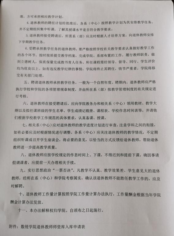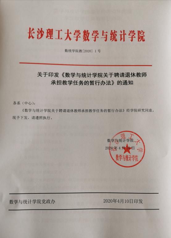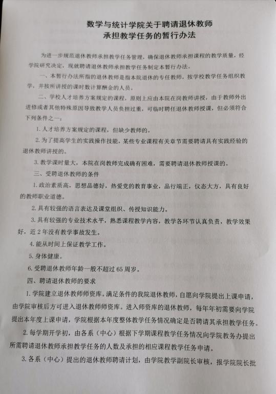 关于印发《数学与统计学院关于聘请退休教师承担教学任务的暂行办法》的通知