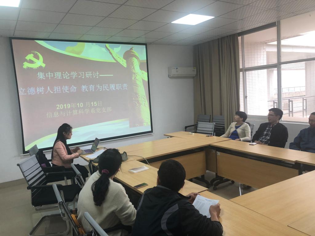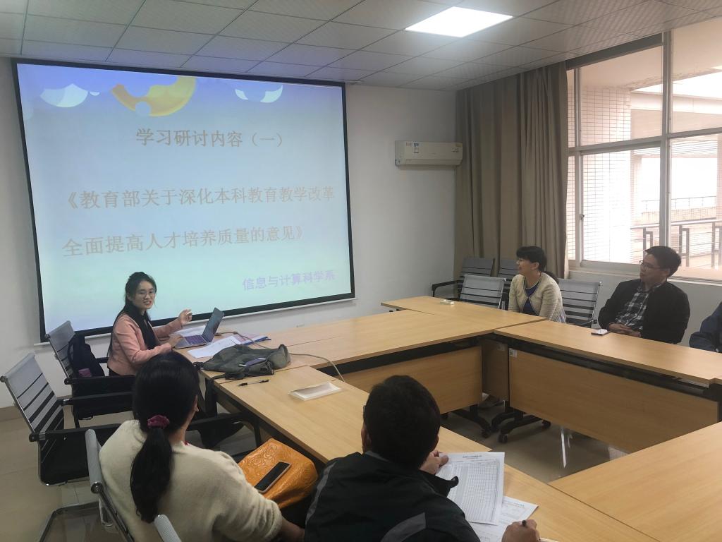 在“立德树人担使命,教育为民履职责”主题教育背景下,10月15日下午,信息与计算科学系党支部组织全系老师在教研室理科楼A502集中学习了《教育部关于深化本科教育教学改革全面提高人才培养质量的意见》以及《LETOU体育平台2019年度本科教育与人才培养工作考核指标体系》。会议由支部书记李姣主持。