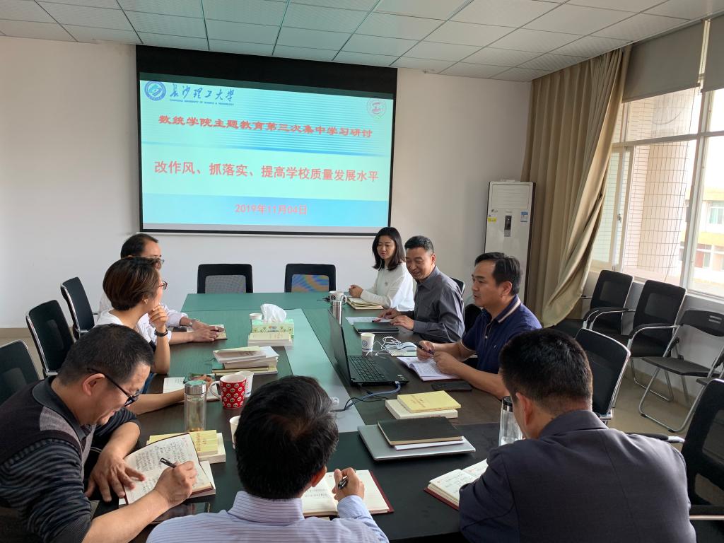 根据学校主题教育工作的统一部署,11月4日,学院在理科楼A503党员活动室组织“不忘初心、牢记使命”主题教育集中学习研讨。主要围绕“改作风、抓落实、提高学校高质量发展水平”进行专题集中学习讨论,由书记张宏伟主持,学院党委委员、领导班子成员参加。