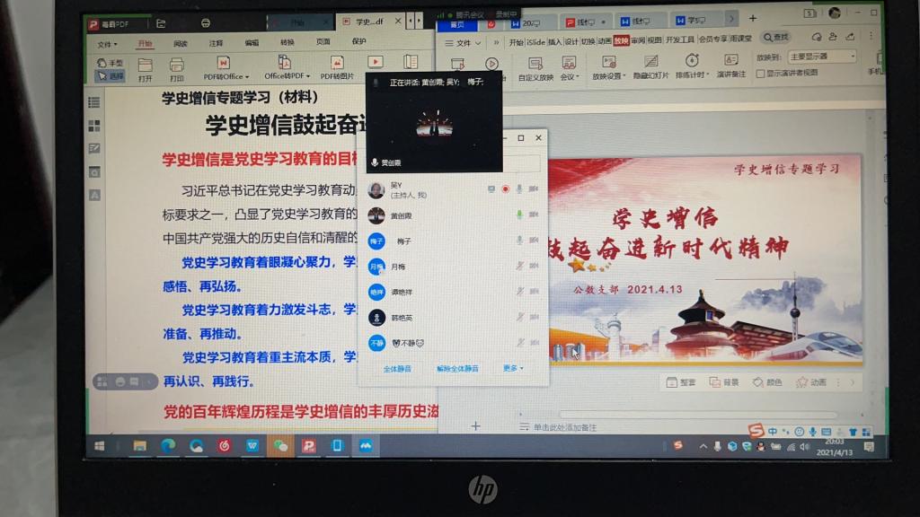 4月13日晚,公数支部通过云会议集体进行了“学史增信”专题板块的学习与交流讨论。会议由支部书记吴烨主持,全体党员到会,集中学习党史学习教育的内涵。