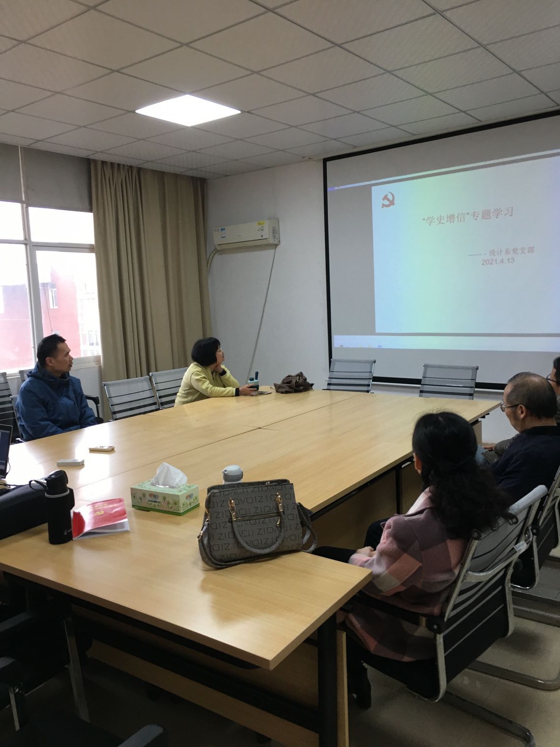 为继续深入贯彻习近平总书记在党史学习教育动员大会上的重要讲话精神,教育引导支部党员,2021年4月13日,数统学院统计系党支部全体党员在理科楼A504开展了以“学史增信”为主题的专题学习会。