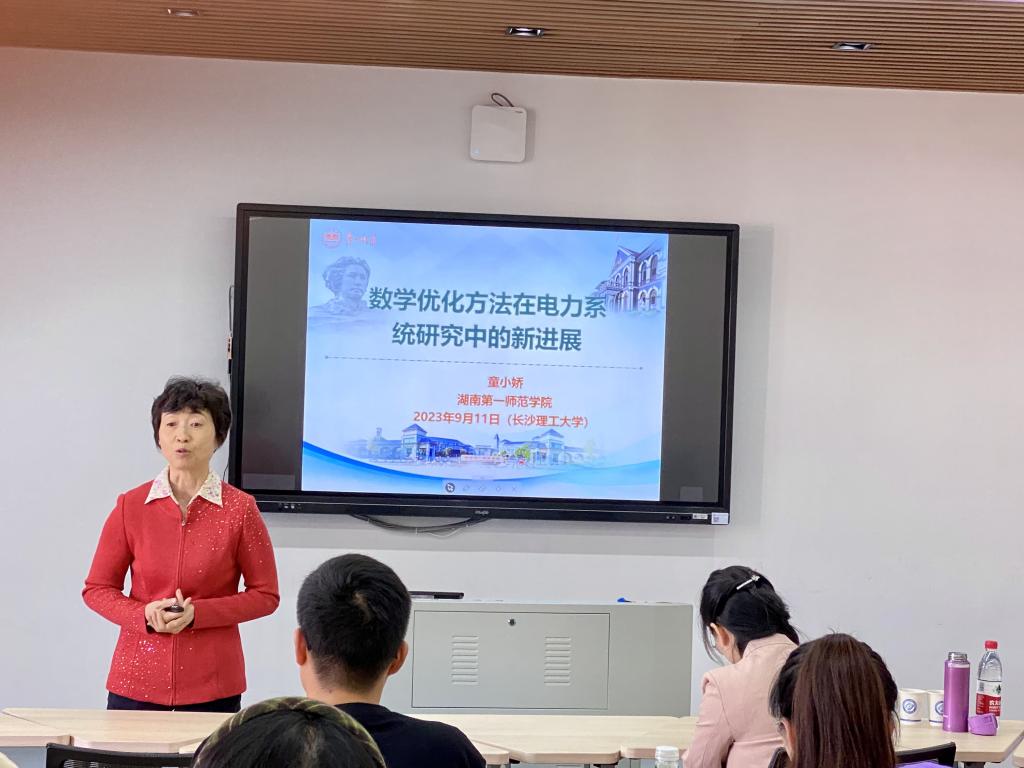 10月11日上午9:30,数学与统计学院在理科楼A419举办题为“数学优化方法在电力系统研究中的新进展”的通识教育讲座,主讲嘉宾是湖南第一师范学院童小娇教授,讲座由数学与统计学院院长张宏伟教授主持。
