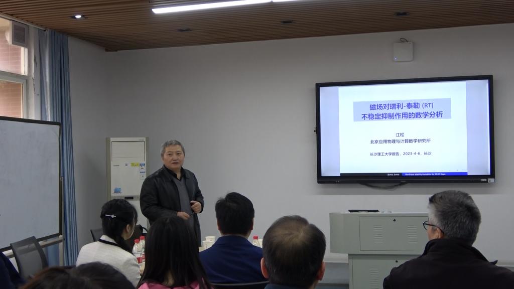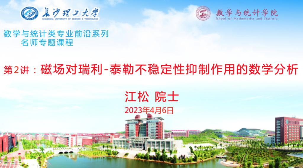 4月6日上午,数统学院开展“数学与统计类专业前沿系列名师专题课程”第二讲,特邀嘉宾是中国科学院江松院士,主题为“磁场对瑞利-泰勒不稳定性抑制作用的数学分析”。讲座由LETOU体育平台副校长黄创霞教授主持。