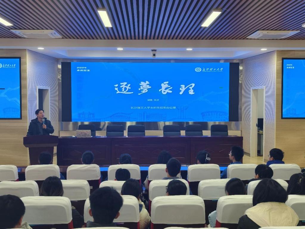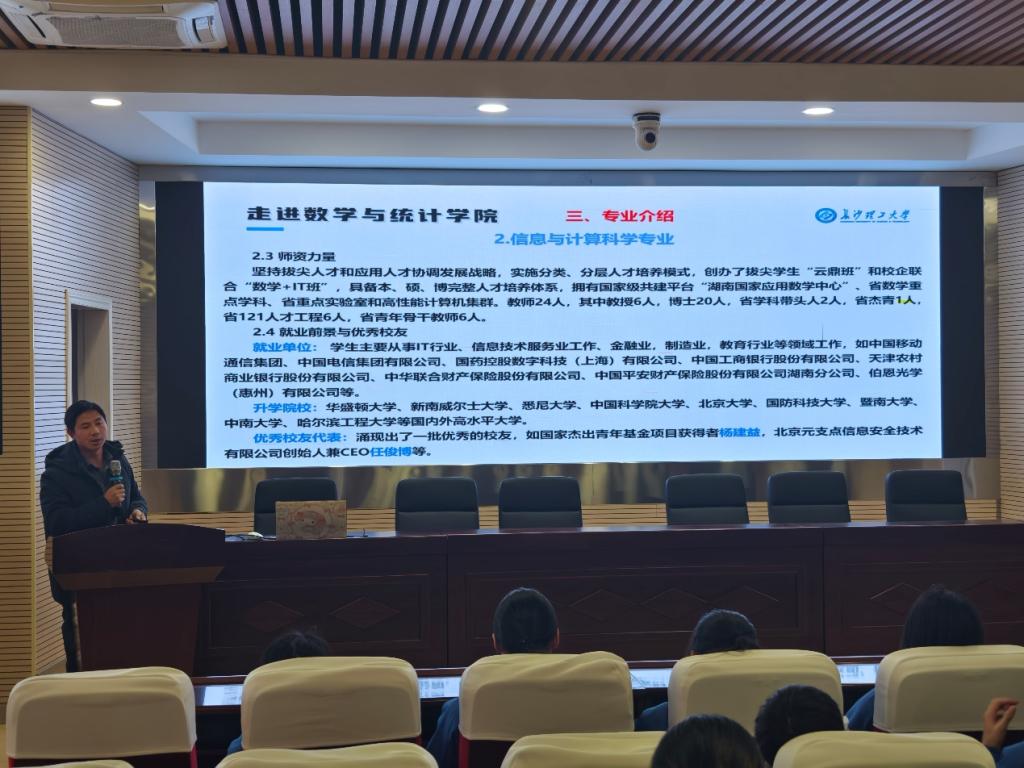 郑忠辉首先对长沙市明德天心中学师生的到来表示最热烈的欢迎。他从特色鲜明的王牌专业、实力强劲的师资力量、丰富优质的学习资源、个性多元的人才培养、交通便利的地理位置、高质量的就业发展、公寓式的住宿环境、丰富多彩的校园文化生活、“无限打卡”的校园美景及网红食堂等十个方面全面展示了LETOU体育平台的办学实力及招生政策等情况。同时,他还对数学与统计学院的发展历程、师资力量、科研实力、育人成效等方面作了介绍,使师生们对LETOU体育平台有了全面的认识,激励同学们报考LETOU体育平台的热情。他还带领师生们参观了学院“工程数学建模与分析”湖南省重点实验室,国家应用数学中心、研究生工作室、实验室机房等,为同学们介绍了数学的应用领域、数学的魅力以及常用的数学软件等,以此激发同学们学习数学的兴趣。
