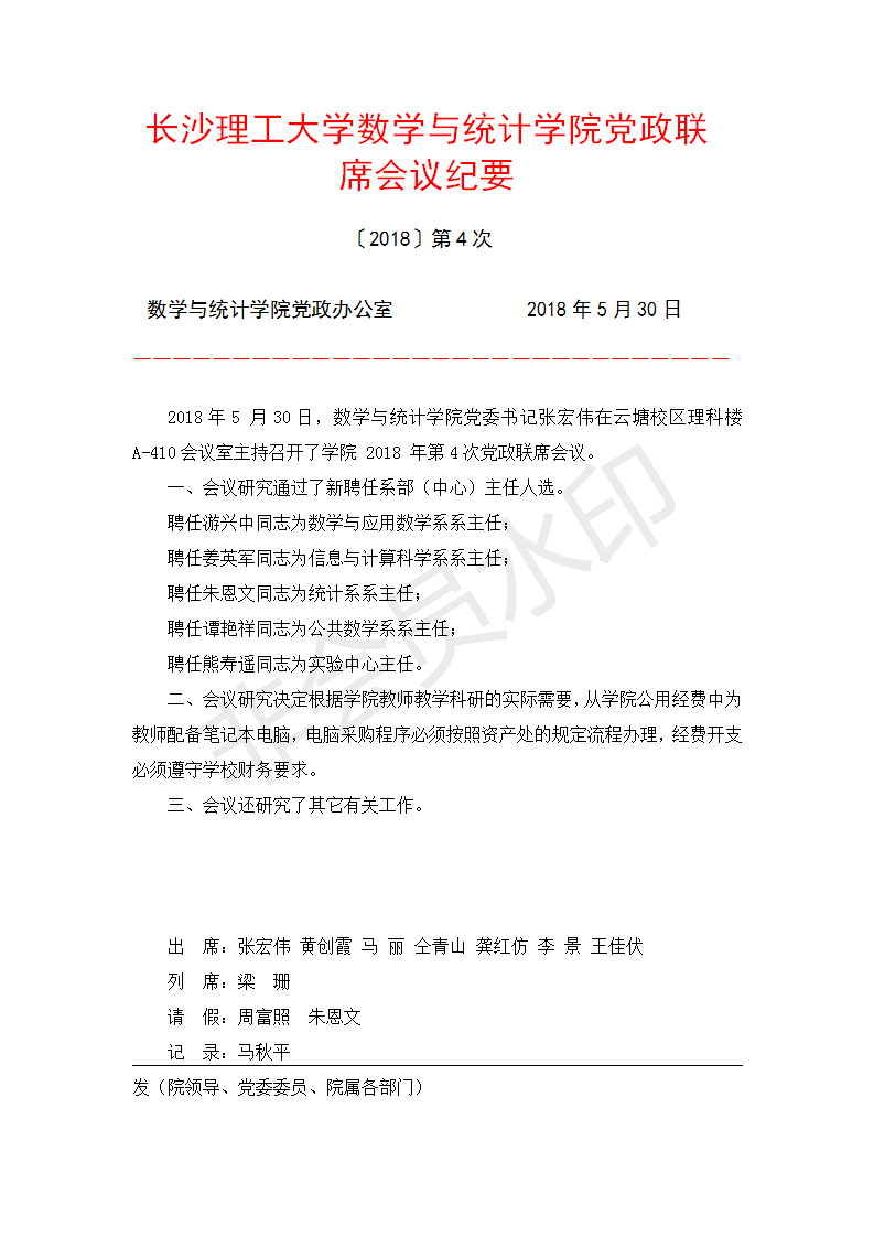 数学与统计学院党政联席会议纪要(2018年第4次)