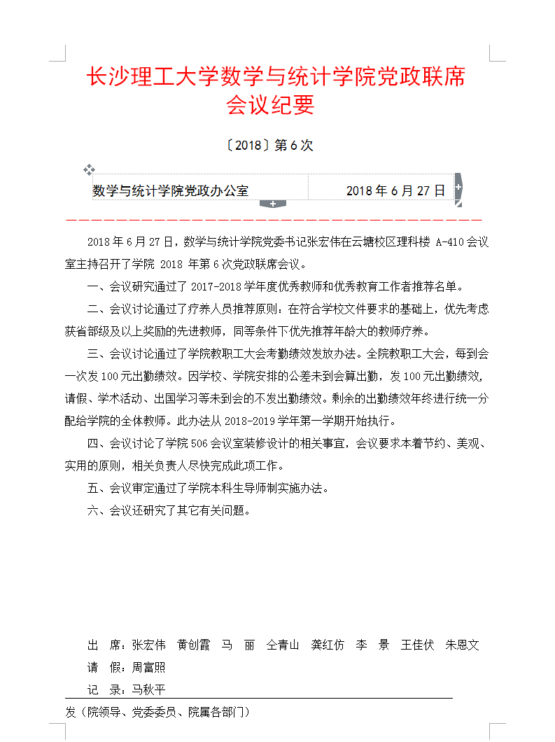 数学与统计学院党政联席会议纪要(2018年第6次)