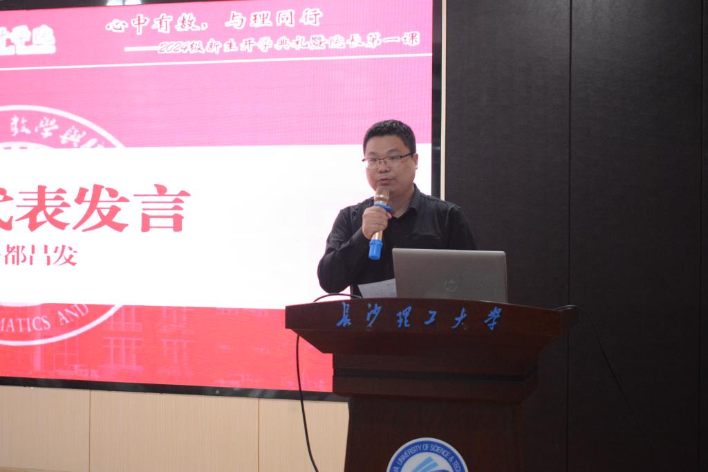 都昌发作为教师代表发言。他强调在大学阶段自主学习和独立思考能力的重要性。希望每位同学明确自己的目标,珍惜时光,持续奋斗,实现梦想。