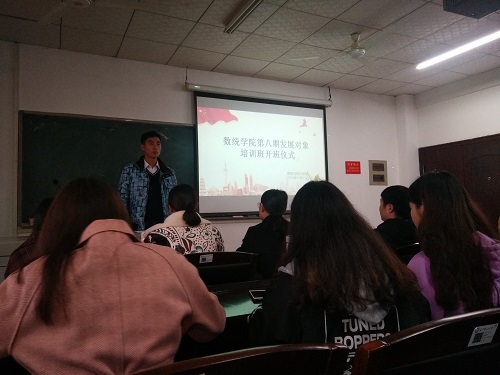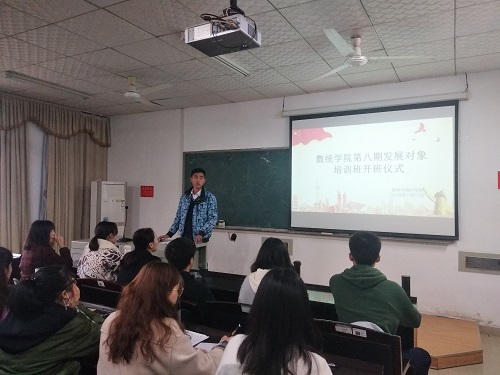 2018年11月13日下午13:40,数统学院第八期发展对象培训班班主任柳映堂老师在理科楼A-419举行了“第八期发展对象培训班开班仪式”。培训班班长郭银方、负责人肖璐以及全体发展对象参加该开班仪式。