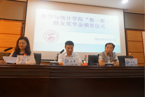 6月21日下午,数学与统计学院在理科楼B311隆重举行了“数一数二”校友奖学金颁奖仪式。出席本次会议有数学专业84级校友吴启茂、党委书记张宏伟、分团委书记郑国义、16级辅导员柳映堂以及各班学生代表。颁奖仪式由党委副书记马丽主持,