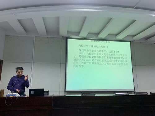 开班仪式结束后,培训班第一课由学校特邀党建组织员毛光华主讲。毛光华从高校学生干部应该培养和具备的良好素质、较强能力和良好作风三方面展开。首先毛光华强调到,学生干部首先是学生,也是本分,要努力成为一名品学兼优的大学生。接着,他从思想政治素质、道德素质、人文素养、心理素质等方面对高校学生干部应具备的良好素质做了详细分析,由概念到重要性再到提高途径,层层深入,环环相扣。