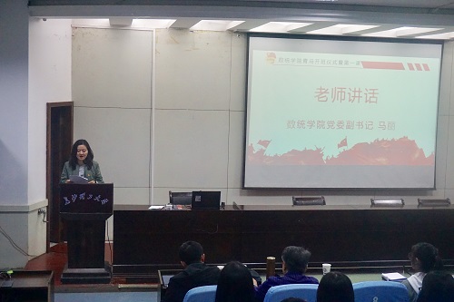 伴随着共青团团歌响起,青马班开班仪式拉开了序幕,接着柳映堂介绍出席仪式的领导并介绍青马班筹备情况,院团委学生会组织部副部长张曼钰宣读青马班学员纪律,最后学院党委副书记马丽讲话。马丽首先代表学院党委对开班仪式表示祝贺,接着对青马学员提出认真学习,提升素养,增强思想的先进性、志存高远,铸牢信念,增强理想的先进性和开拓创新,知行合一,增强行动的先进性三点希望和要求,强调学员们应以本次开班仪式为起点,用奋斗和汗水谱写新的篇章,成就美好的未来。