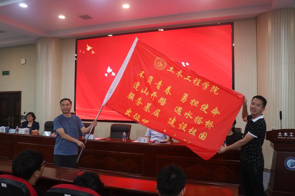 “青年人为新时代的代言人,每一个波澜壮阔的时代,青年总立于时代的潮头。”土木学院党委书记江河为毕业生赠书授旗,寄语毕业生们,须知勤奋学习才是青春远航的动力,增长本领才是青春搏击的能量。青年人作为社会中最富有活力的群体,要始终相信“广阔天地,大有可为”,带着“逢山开路遇水搭桥”的开拓精神、带着“土累天下,木承苍穹”的土木精神,拨时代之浪潮,担时代之使命,扎根基层,建设祖国。让青春在党和人民最需要的地方绽放绚丽之花,让“长理人”这张名片在祖国的建设中更加鲜艳闪亮。