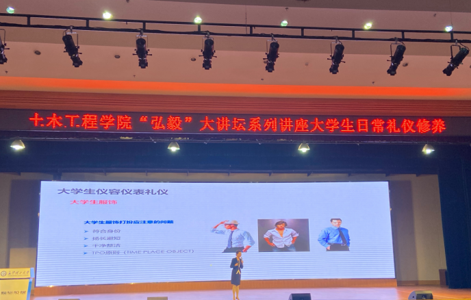 11月23日晚,土木工程学院在金盆岭校区五教大礼堂开展了大学生礼仪培训讲座,主题为“魅力形象,崇真尚美”。活动邀请到ACI国际注册高级礼仪培训师周东喜老师主讲,校研究生院副院长兼研工部部长田上、院党委副书记黄阿明、研究生辅导员李小军、2021级辅导员刘文成、邓文杰出席活动。本次活动采取线上线下相结合的方式,2021级研究生和本科生新生代表聆听了讲座。