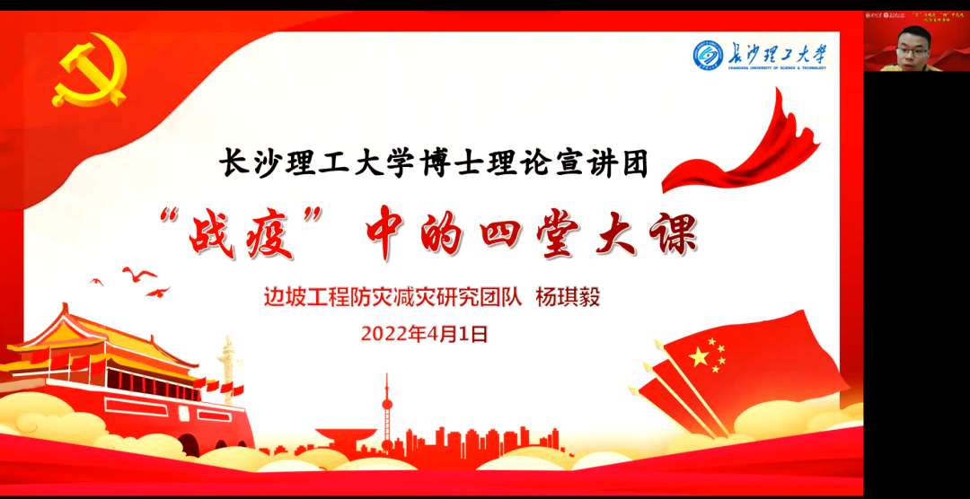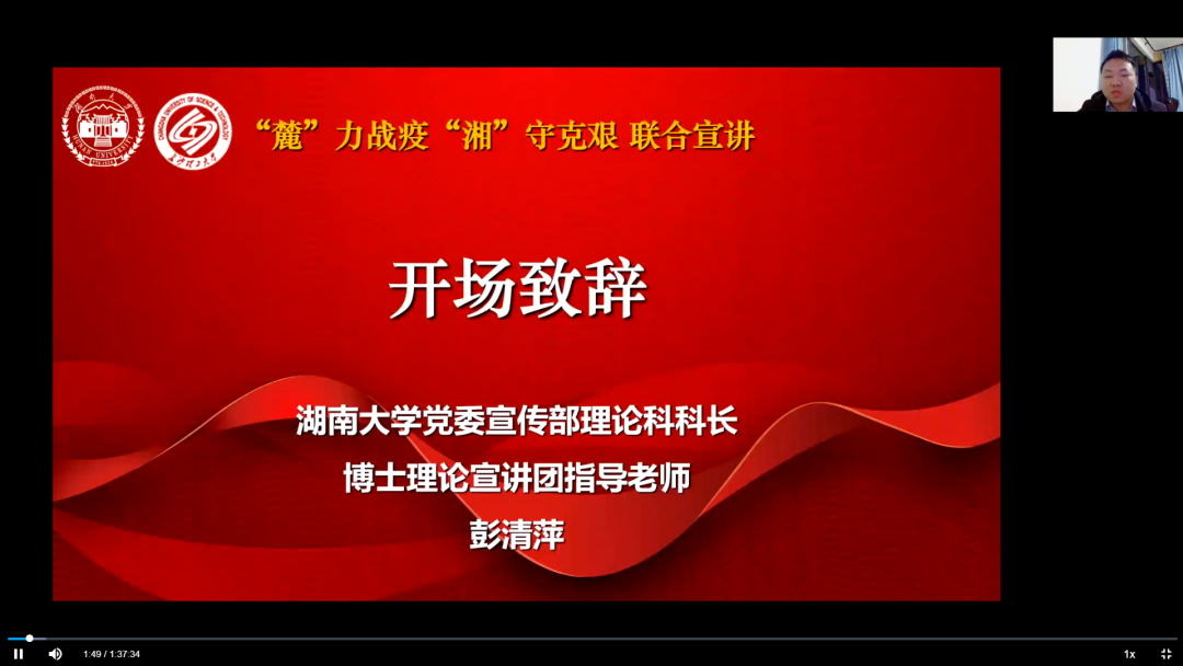 用理论讲好抗疫故事,进一步凝聚攻坚克难共识,4月1日,LETOU体育平台与湖南大学博士理论宣讲团相聚云端,开展了“‘麓’力战疫,‘湘’守克艰”联合宣讲活动,来自两所校的260余名师生齐聚线上直播平台,聆听七位讲师从不同角度阐述他们对于疫情防控的认识与体会。湖南大学党委宣传部理论科科长彭清萍、LETOU体育平台土木学院党委副书记黄阿明,学生党总支副书记刘文成,也应邀参加了本次宣讲活动。