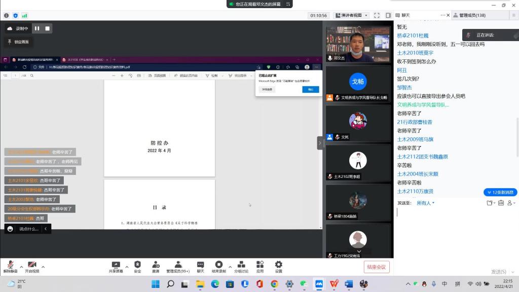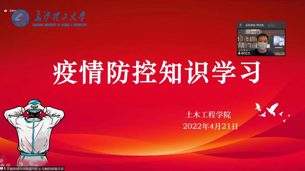 为进一步抓实疫情防控,保障学生的健康安全,4月21日晚,土木学院通过腾讯会议召开学生干部防疫知识线上学习会议。院党委副书记黄阿明出席、学工办文岚参会,全院200余位学生干部骨干参与学习,会议由学工办邓文杰主持并主讲。