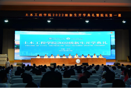 9月13日晚上,土木工程学院在金盆岭校区五教大礼堂举行2022级新生开学典礼暨院长第一课。学院全体班子成员,各科(系)室主任,2022级全体班主任、全体辅导员、下班干部及2022级全体新生参会。本次会议由学院党委副书记黄阿明和2022级新生傅茵共同主持。