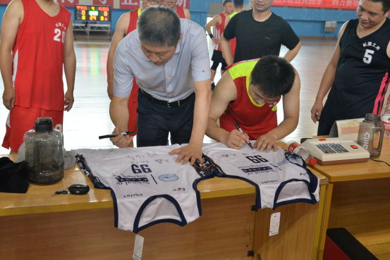 中场休息时刻,现场举行师生三分球投篮大赛和毕业签名球衣赠送仪式。本科生队、研究生队和教工队各派出3名选手,参赛选手要在3分线外地点投篮,投5次记录进球数,经过激烈比拼,本科生代表队余承操同学以“5中3”的出色表现获得了“三分王”的称号。在毕业签名球衣赠送环节,江河和王磊代表学院向毕业生代表赠送了签名球衣和篮球,并合影留念,寄托了学院对2023届全体毕业生早日成才的祝福和期望!