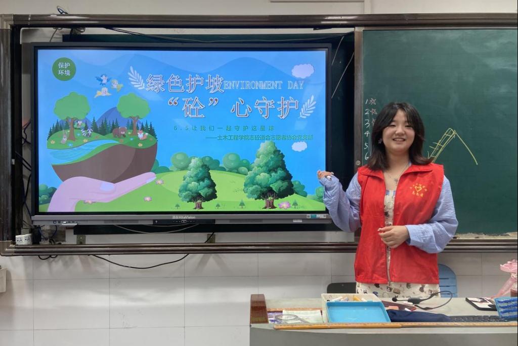 在活动现场,来自该学院志砼道合协会党支部的入党积极分子尹茹惠首先利用模型和图片向孩子们讲解了边坡防护的重要性及其工作原理。她通过实验展示如何在模拟降雨条件下防止水土流失,让孩子们亲身感受到环境保护的紧迫性。志愿者们还引导学生讨论日常生活中可以采取的环保措施,激发他们将所学知识应用于实际生活中。