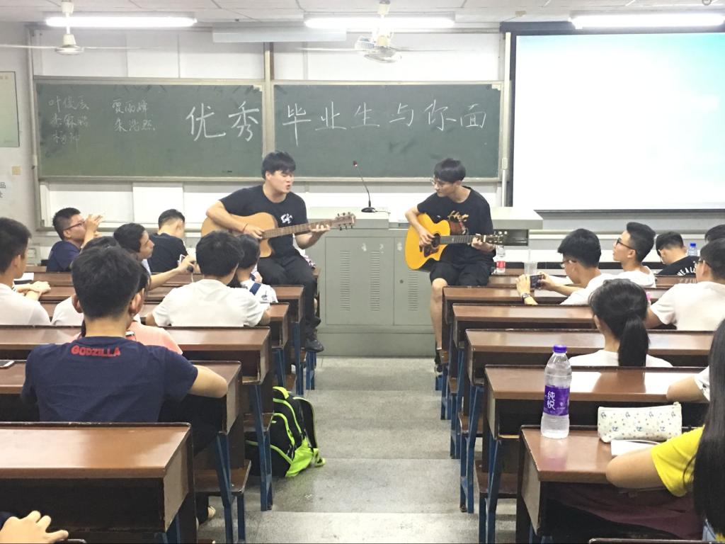 为了本次交流活动,学长们作了精心准备,旨在传授与分享自己多年的学习与工作经验,为16级学生提供满满的干货。沙龙伊始,被同济大学和湖南大学双保研的叶俊辰学长向大家简单地介绍了在场的各位学长,并分享了自己的求学经验与学习方法。他认为,应当把学业放在首位,学会划分学与玩的界限,掌握正确的学习方法,提高课堂的效率,才能做到事半功倍。接下来,其他四位学长也分别讲述了自己大学四年的学习经历。其中,杨帅学长提出要学会自我管控,不能沉迷于手机和游戏,建议多参加有益的活动。他们各具风格,语言生动幽默,在场的学生都听得十分认真。活动期间,叶俊辰学长与16级陈湘同学还进行了现场吉他弹唱,这一绝妙的听觉盛宴,调节了现场氛围,赢得了大家阵阵的掌声。最后,参会的学生就感兴趣的问题积极向学长进行提问,学长一一进行了详细地解答。现场气氛极为活跃,沙龙活动一度进入高潮。