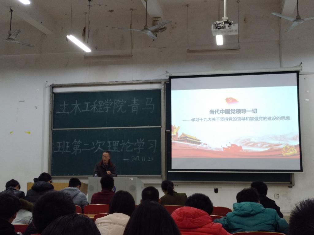 11月20日晚,土木工程学院在工一A106组织开展青马班第二次理论学习,院党委书记张可荣教授进行了题为“当代中国党领导一切”的专题授课,带领学院全体学生骨干学习十九大关于坚持党的领导和加强党的建设的思想。院团委书记叶正芳、党建辅导员龙承运出席。
