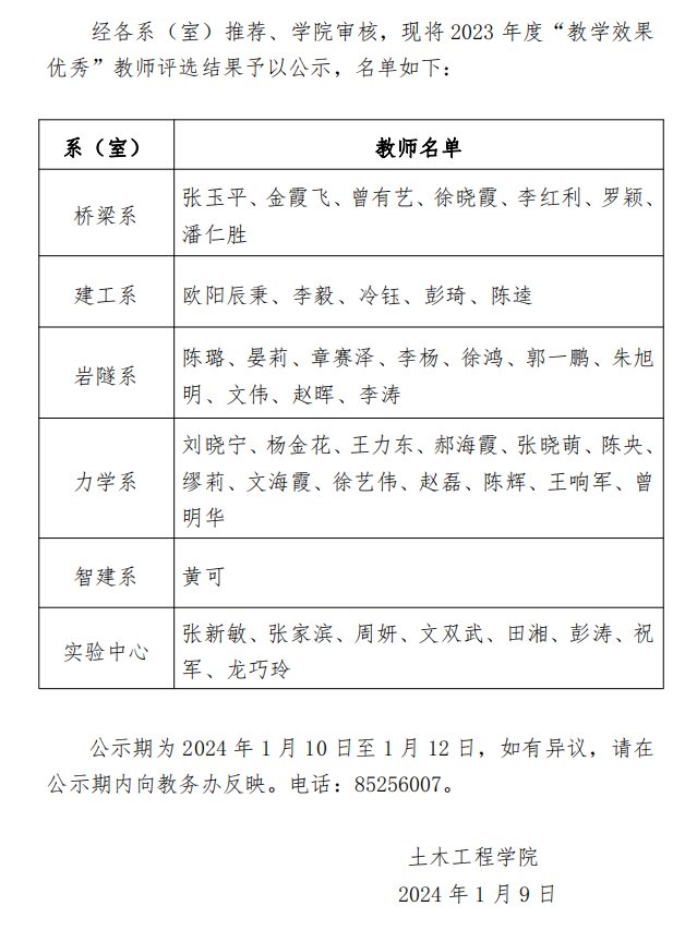 关于土木工程学院2023年度“教学效果优秀”教师评选结果的公示