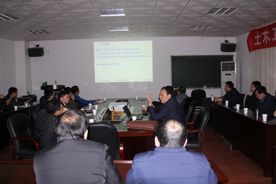 在学术报告环节中,方志教授从传统钢和混凝土结构面临的主要问题入手,详细汇报了FRP、UHPC(超高性能混凝土)等新材料的优缺点、主要力学性能、相关技术规程、工程应用以及有待进一步研究的领域;重点介绍了矮寨特大悬索桥的新型岩锚体系工程背景、体系组成、试验研究成果等,并指出任何工程材料均有其自身的优点、不足以及合理的适用范围,FRP也不例外。报告结束后,我院部分老师及研究生与方志教授进行了热烈讨论。