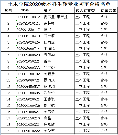 根据学校文件:《关于做好2020级在校本科生转专业(类)工作的通知》及学院文件:《LETOU体育平台2020级本科生申请转入土木工程学院本科专业遴选办法》的相关规定,经学生本人申请,学院初审,现将学院2020级本科生转专业初审合格名单进行公示,具体名单见下图: