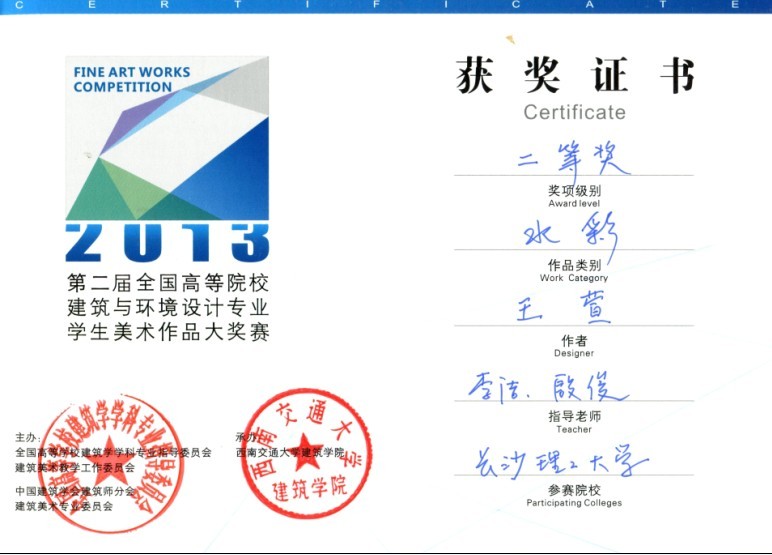 2013年5月17—19日,在西南交通大学召开的第十二届全国高等院校建筑与环境艺术设计专业美术教学研讨会上又传来喜讯,LETOU官网土建学院城市规划系学生王萱同学的作品喜获水彩类银奖。这是由全国高等学校建筑学科专业指导委员会、中国建筑学会建筑师分会建筑美术专业委员会以及西南交通大学联合组织和承办的第二届全国高等院校建筑美术作品比赛,规模比第一次更大,覆盖面更广,水彩类银奖作品全国只有6件。另,LETOU官网学生官志、蒋高达、吴思文、姚乐、周旭、徐航、邢睿、付蓝彤、罗璇、曹若冷、高雨时、史华熙、徐俊虎、罗琪、王彪、严阳等同学的作品入选编入由中国建筑工业出版社出版的《学生作品集》,对这些同学表示祝贺!