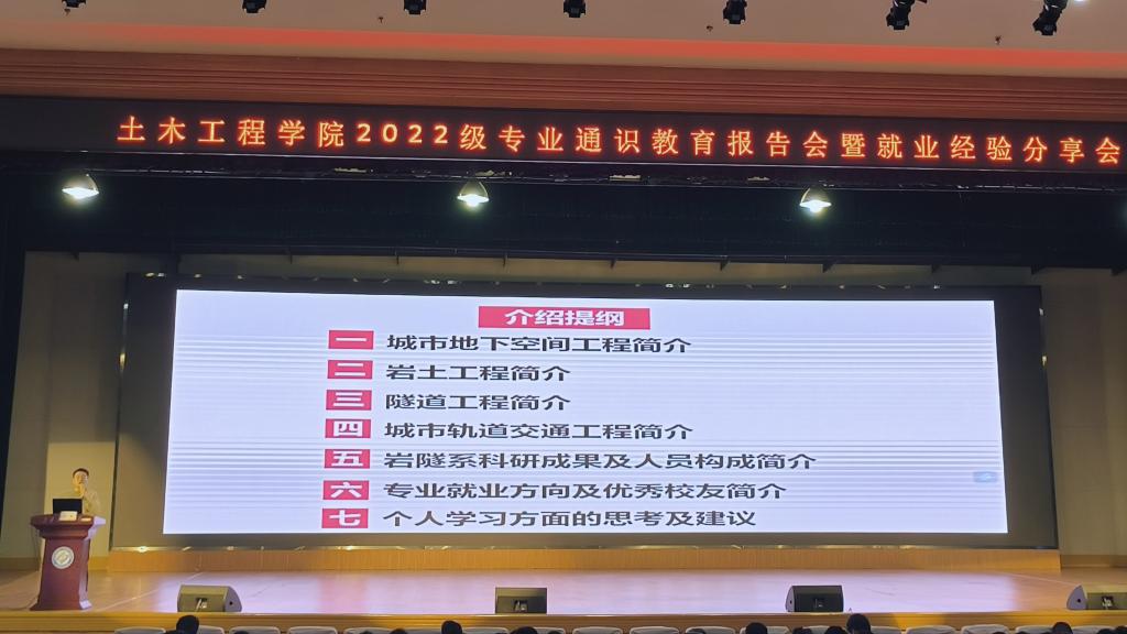 肖南对“城市地下空间工程、岩土工程、隧道工程、城市轨道交通工程”等专业分别进行了介绍,然后对本校的岩隧系人员组成进行介绍,并且向同学们展示了岩隧系人员的科研成果。随后,他介绍了在城地岩隧专业方面上的就业方向,以及LETOU体育平台的优秀校友。最后,他勉励同学们努力学习、提升自我,并提出了12条个人学习方面的思考及建议。希望同学们能够取得好的成绩,变得更加优秀,以后成为国家的栋梁之才。