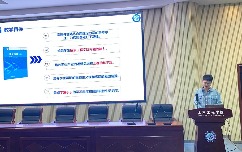 赵晖老师代表《基础工程》课程教学团队、徐晓霞老师代表《结构设计原理》课程教学团队、赵磊老师代表《理论力学》教学团队、陈逵老师主讲课程《工程建设法规》进行了课程思政展示。四位老师从自身学科特点出发,以说课的形式,以45分钟的课程内容为载体,从教学目标、教学设计理念、教学目标、教学方法等方面着手,挖掘所授课程蕴含的思政教育元素,立足所讲内容,展开精彩的讲授,做到专业知识讲解和课程思政有机融合,育人元素深入浅出,展现出各具特色的教学设计和教学风采。