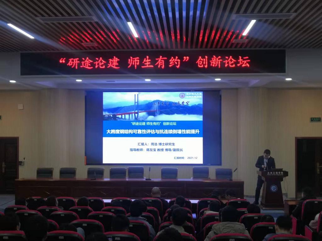 蒋友宝作了题为“3D打印与土木工程建造技术”的学术报告,内容涵盖“3D打印技术概述和发展、土木工程专业介绍与3D打印建造技术、3D打印建造技术的特点与应用现状、基于3D打印的土木工程建造技术展望和团队3D打印方向成果汇总”等五个方面的内容。他指出,3D打印技术具有无需支模、自动化程度高、安全性高、可以实现复杂曲面结构等特点。他强调,3D打印技术将来在土木工程行业的应用会结合拓扑优化、人工智能、装配式来实现复杂的结构外形以及大型结构的快速建造。周浩作了题为“大跨度钢结构可靠性评估与抗连续倒塌性能提升”的汇报。他通过例举鄂尔多斯那达慕主会场坍塌事故和美国哈特福德体育馆坍塌事故,指出了研究大跨度钢结构可靠性评估以及提升其抗连续倒塌性能的重要性和现实意义。他以岳阳三荷机场的建设为实例,系统地介绍了在可靠性方面最受欢迎的代理模型之一——多响应面方法。他指出,多响应面方法可以很好的应用于多失效模式和单一失效模式的情况,并且仅需较少的有限元分析就可以获得较准确的可靠性结果,因此特别适用于大型结构。