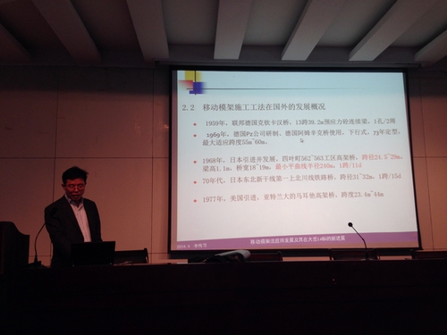 李教授首先对移动模架施工技术国内外发展动态进行生动的阐述,并通过与悬臂施工、顶推施工等方法进行比较,突出移动模架施工技术的特点与合理的适用范围。然后结合工程实例对移动模架的施工工艺流程、如何提高移动模架设备的适应性、易操作性、安全可靠性等进行了专家解读,最后对移动模架在大岳14标的应用创新形式以及施工控制中的关键问题进行了精彩的讲解。