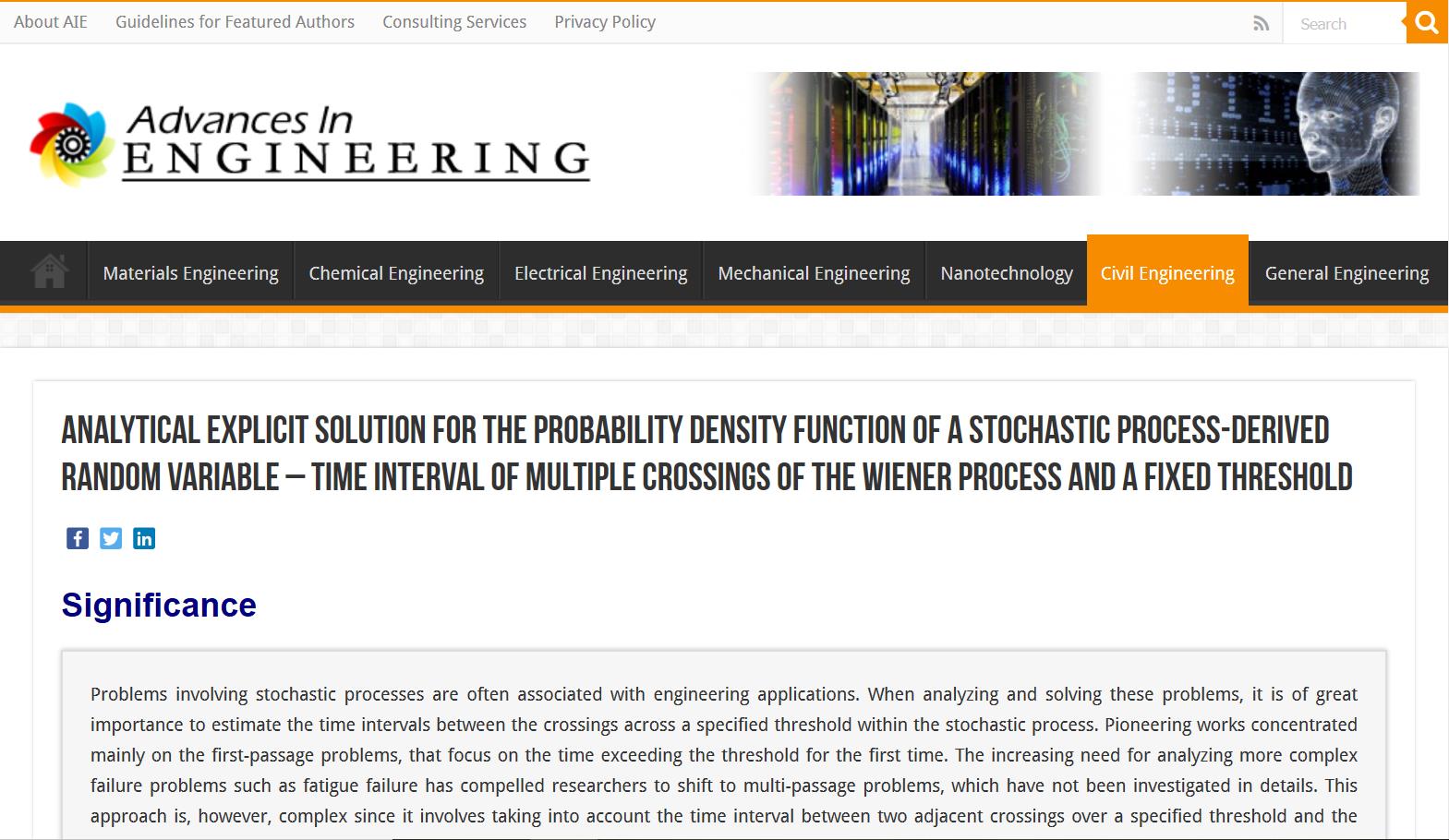 近日,我院张振浩副教授课题组发表在国际权威期刊《Mechanical Systems and Signal Processing》(中科院分区TOP期刊,影响因子5.005)上的论文“Time interval of multiple crossings of the Wiener process and a fixed threshold in engineering”被全球著名科技媒体机构工程进展Advances in EngineeringAIE)遴选为关键科学文章(key scientific article),并以“Analytical explicit solution for the probability density function of a stochastic process-derived random variable – time interval of multiple crossings of the Wiener process and a fixed threshold”(一个由随机过程派生的随机变量-“Wiener过程与固定界限多次交叉时间间隔的概率密度函数解析显示解)为题进行了报道。