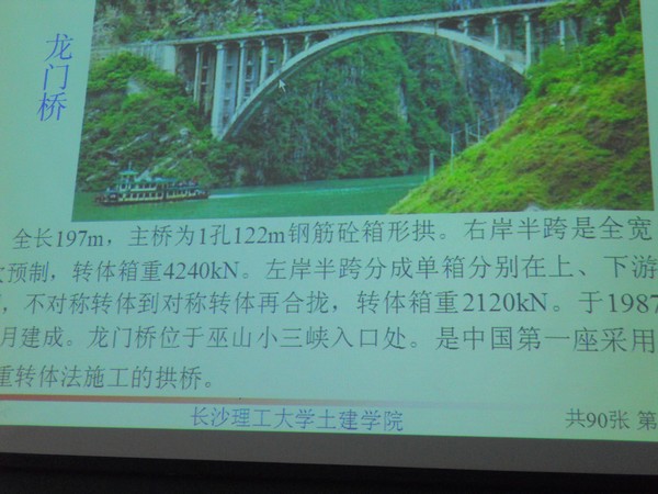 杨教授首先用一组造型美观、知名度高的桥梁实例给同学们介绍了桥梁工程既是一种功能结构,也是一种艺术工程,然后详细介绍了:①桥梁结构形式;②桥梁基本组成;③桥梁分类。