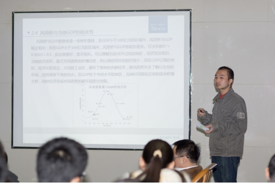 建筑学研究生邹偲康交流的主题是《湖南省资江流域风雨桥空间分布格局研究》,他介绍了他运用数学和统计学的方法分析资水流域风雨桥分布情况的工作,研究了风雨桥数量与古代交通路线图、当地年均降水量、人口密度、GDP的相关性,对于建筑学的学生来说,这是跨学科的一种方法。