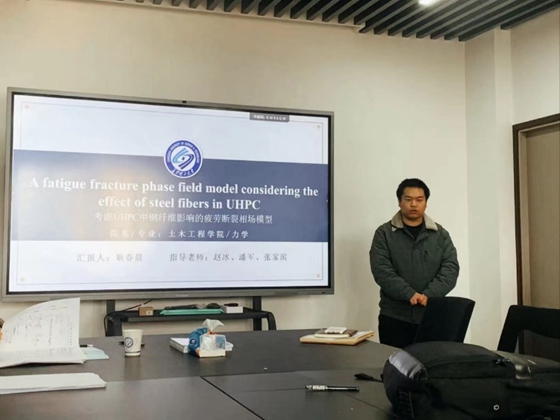 研究生耿春晨做了以《A fatigue fracture phase field model considering the effect of steel fibers in UHPC》为题的汇报。其介绍了考虑超高性能混凝土(Ultra-High Performance Concrete, 简称UHPC)中钢纤维影响的疲劳断裂相场模型;分析和讨论了钢纤维对UHPC疲劳性能的影响机理;并对UHPC结构优化设计提出建议。