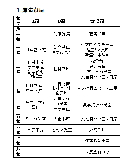 2.表中标注为①~⑥的库室文献资料概不外借,仅限在该库室阅览。