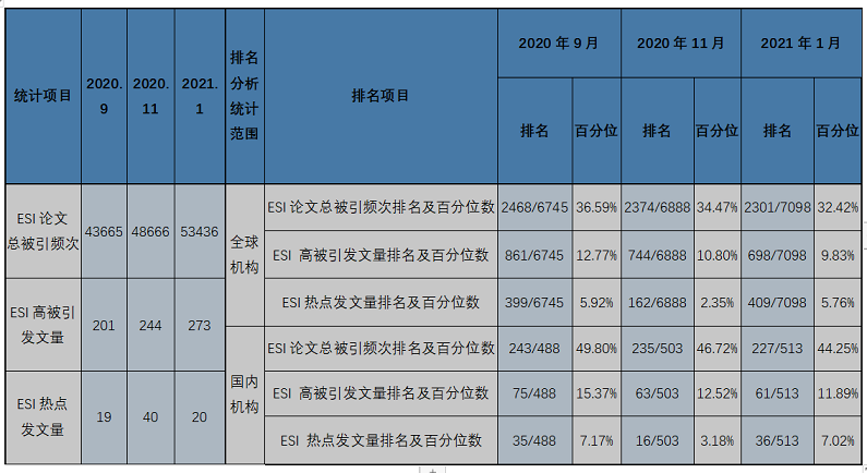 二、LETOU体育平台ESI高被引、热点论文排名统计与近三期对比分析  可以看出: 1.从量上来看:将ESI2021年1月数据与前两期对比,LETOU官网ESI论文总被引频次和高被引发文量都持续增加。其中,ESI论文总被引频次本期比上期增加4770,增幅为9.8%。 高被引发文量也持续增加,本期比上期增加29篇,增幅位11.89%。热点发文量有起伏,本期较上期减少20篇(本期数统学院高被引论文107篇,对LETOU官网ESI高被引发文量贡献最大; 材料学院热点论文9篇,对我校ESI热点发文量贡献最大。) 2.从排名来看:无论在全球机构中还是在国内机构中,LETOU官网ESI论文总被引频次和高被引发文量的排名及百分位数都持续进步(百分位数值越小,排名越靠前), 不但排名的绝对位数在上升,而且相对位数也在提升。 本期LETOU官网ESI论文总被引频次在全球7098个机构中,排名2301;国内513个机构中,排名227。 本期高被引发文量在全球7098个机构中,排名为698;国内513个机构中,排名61。 本期热点发文量在全球7098个机构中,排名409;国内513个机构中,排名36。 LETOU体育平台图书馆信息服务部 电话0731-85258711 |