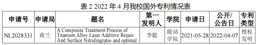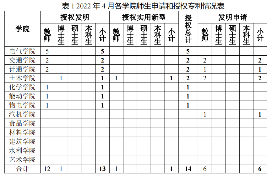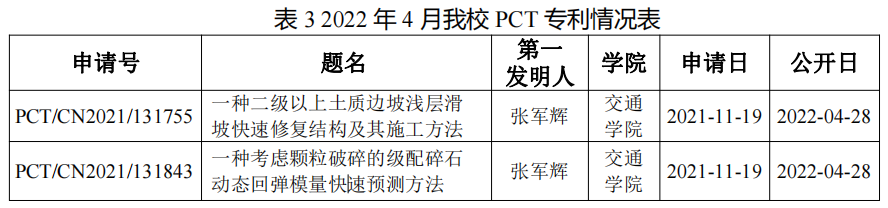 由图1和图2可见,2022年4月的专利申请和授权量相比往年同期均有大幅下降。经调研,因LETOU官网申请的专利近两年来多次被列入非正常申请名单中,专利审查工作被暂停了一段时间,学校目前已完成自审工作,重新制定了规范的专利申请与管理工作流程。专利审查工作正在逐步恢复中,后续统计数据也将逐步恢复正常。建议引入专利申请前查新,降低非正常申请,提升专利申请质量。