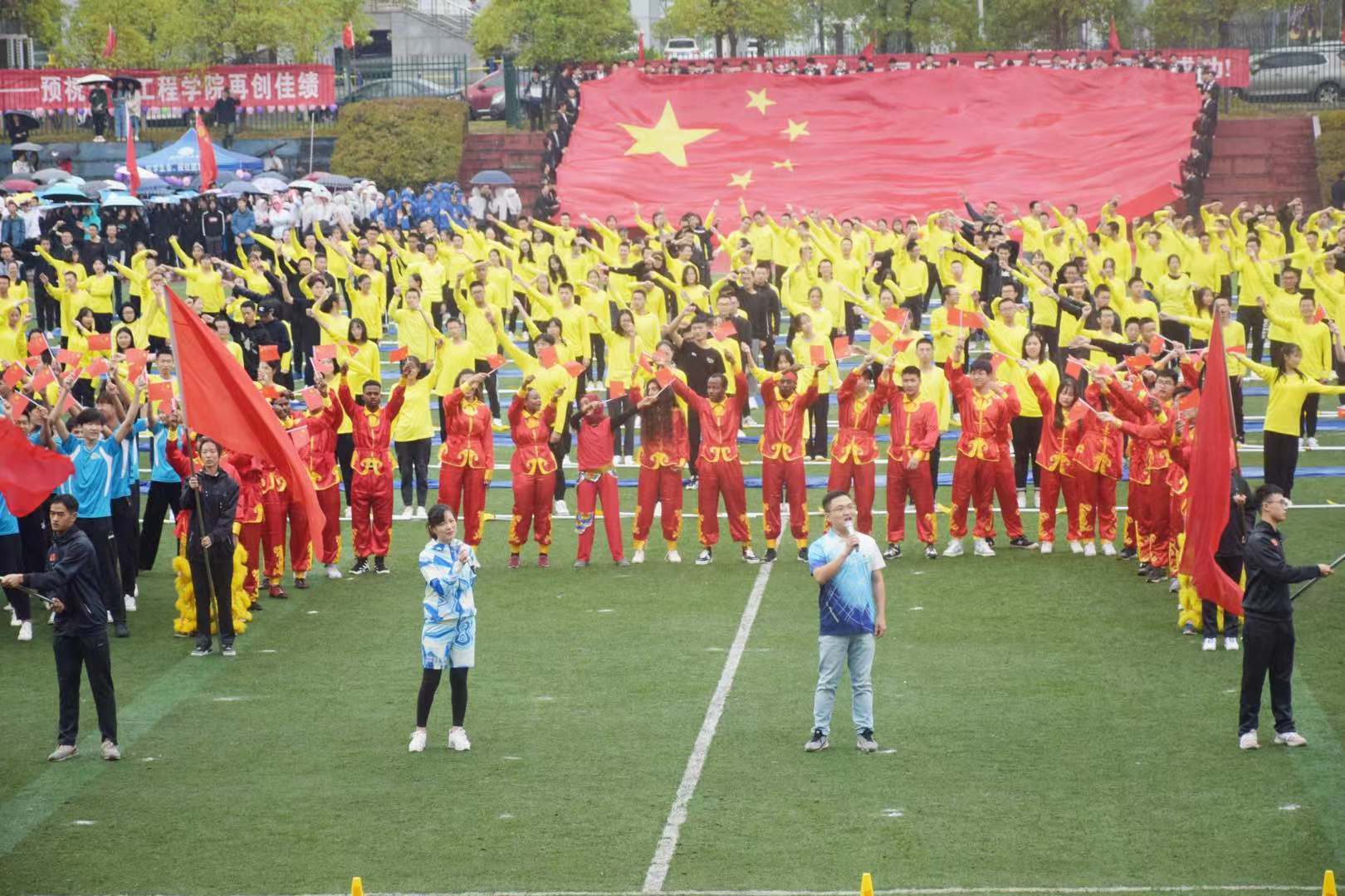 伴随着激昂的运动员进行曲,四名执旗手昂首挺胸,高举鲜红的五星红旗,迈着整齐有力的步伐进入会场。校旗队、校徽队、校训队、鲜花队、红旗队、以及由各学院运动员教工代表组成的方阵紧随其后。他们挺胸抬头、热情昂扬地依次经主席台走过会场。