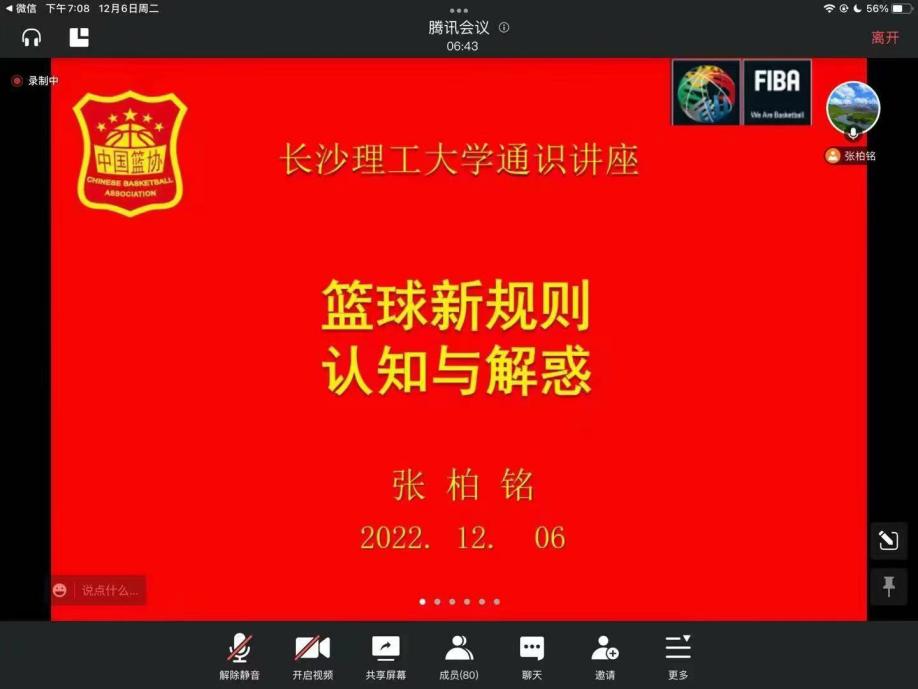 为倡导学生积极参与篮球活动,提高学生对篮球运动的兴趣,促进学生对于篮球新规则的理解,引导学生体味篮球运动新魅力,12月6日晚7点,体育学院教师、湖南省篮协裁委会副主任张柏铭于线上腾讯会议举办了“篮球新规则的认识与解惑”主题知识讲座。此次讲座以“理论与实际共进行,传承与创新共发展”为指导思想,以“塑造价值,培养能力”为目的,吸引了校内校外百余名篮球爱好者参与。