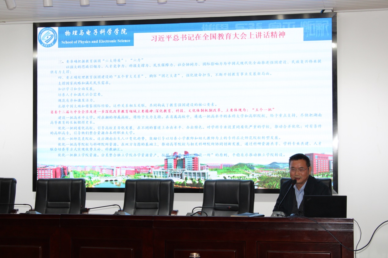 大会上,党委书记张国强带领教职工学习了习近平总书记在全国教育大会上讲话精神和湖南省十二届七次全会精神。