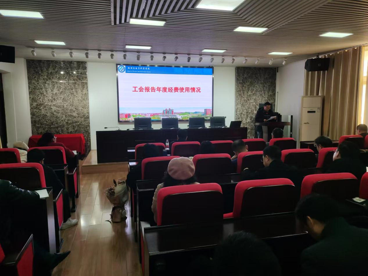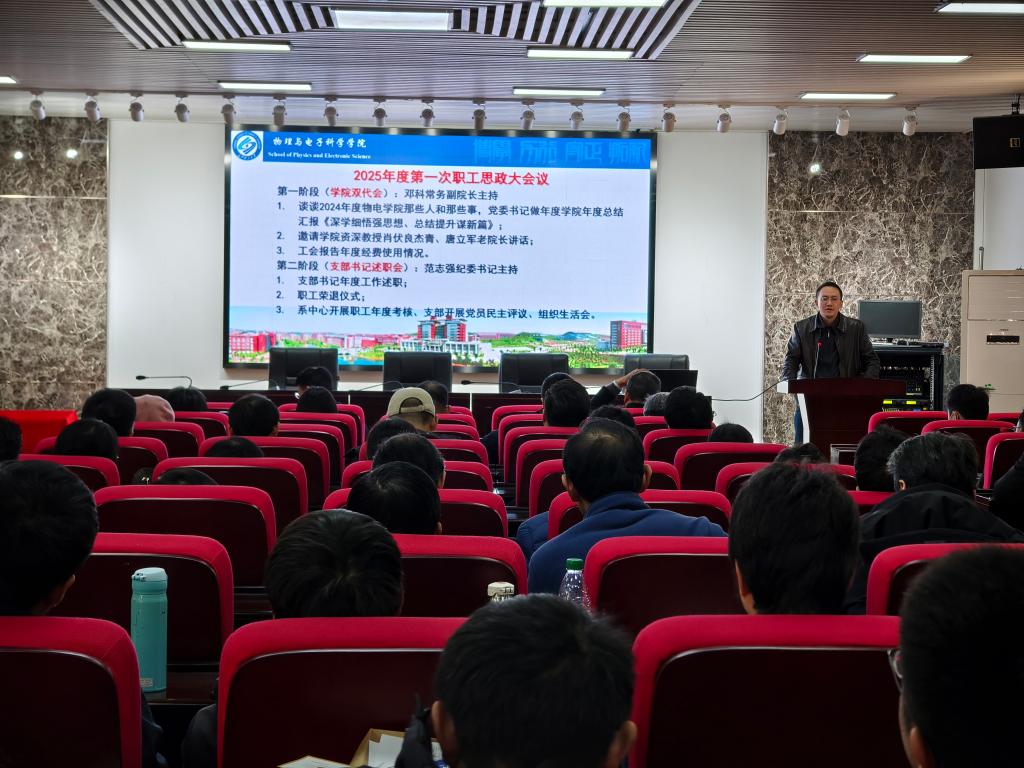 分工会主席范志强向老师们报告了工会工作及经费使用情况,学院党委书记张国强全面系统总结了学院2024年度学院各方面工作并作了重要讲话。他指出在全院教师的共同努力下,学院2024年在党建引领、人才培养、科学研究、综合治理等各方面取得了长足的进步,成功获批物理学一级博士学位授权,实现“双博点”单位与国家级人才新突破,学院发展进入一个新的历史方位。他对老师们潜心教学,爱岗敬业,扎实工作,为学院的发展做出的贡献表示感谢。最后,他再次动员全体教职工要以院为家,努力拼搏,在2025年力争取得更大进步,为学院发展做更大贡献。