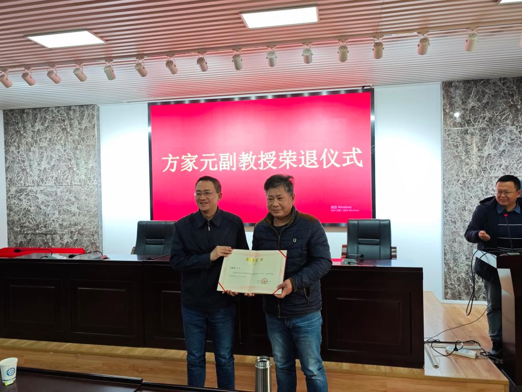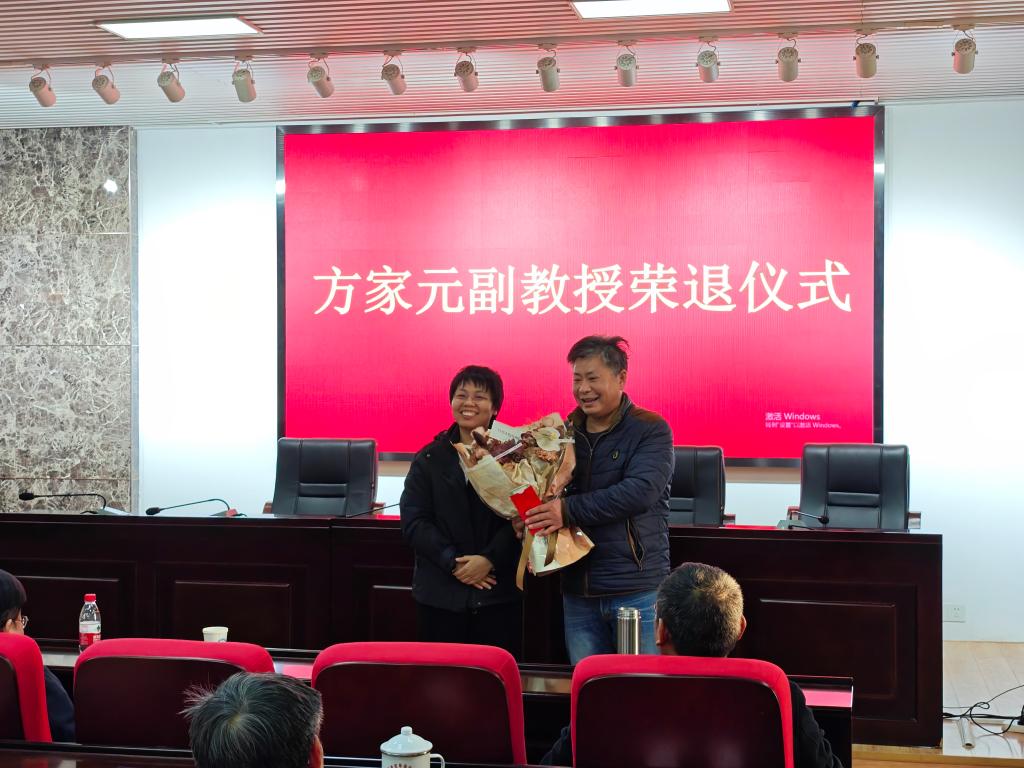 大会还为方家元老师举行了荣退仪式,常务副院长邓科为方家元老师颁发荣退证书,副院长刘斯为方家元老师送上了鲜花和荣退礼物。方家元老师发表了荣退感言,他表示退休后仍然会继续关注学院的教学、人才培养等各项工作,尽全力为学院的发展贡献自己的力量。